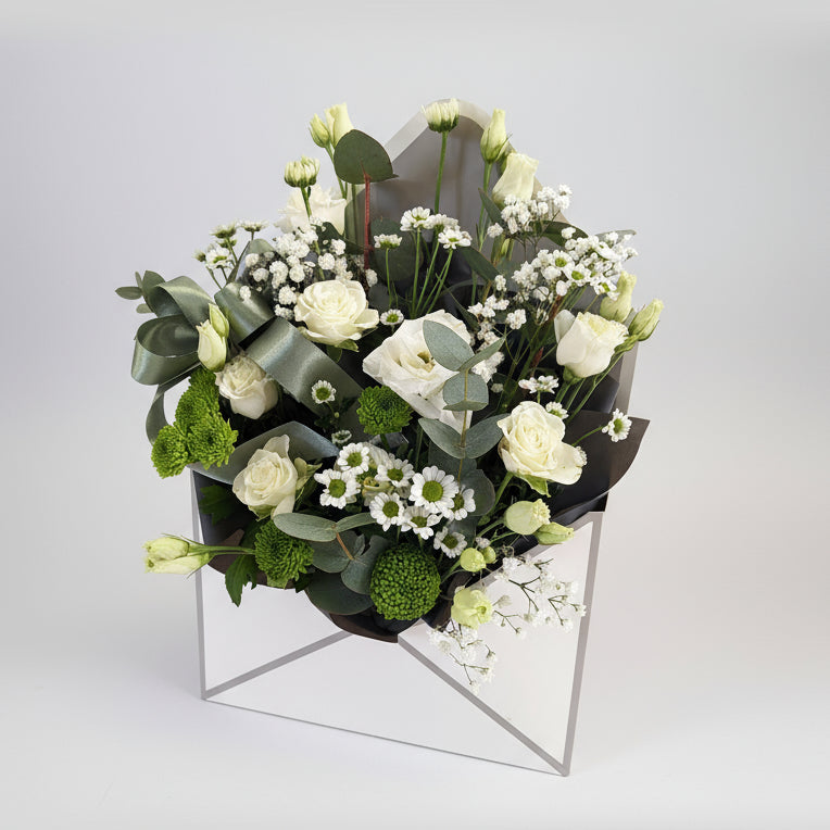 An elegant arrangement bursting full of white and green seasonal flowers. A desktop arrangement created in an envelope shaped giftbox. Arranged in floral foam for ease of care. An ideal gift for someone that has limited space, such as a recipient in a care home or office.