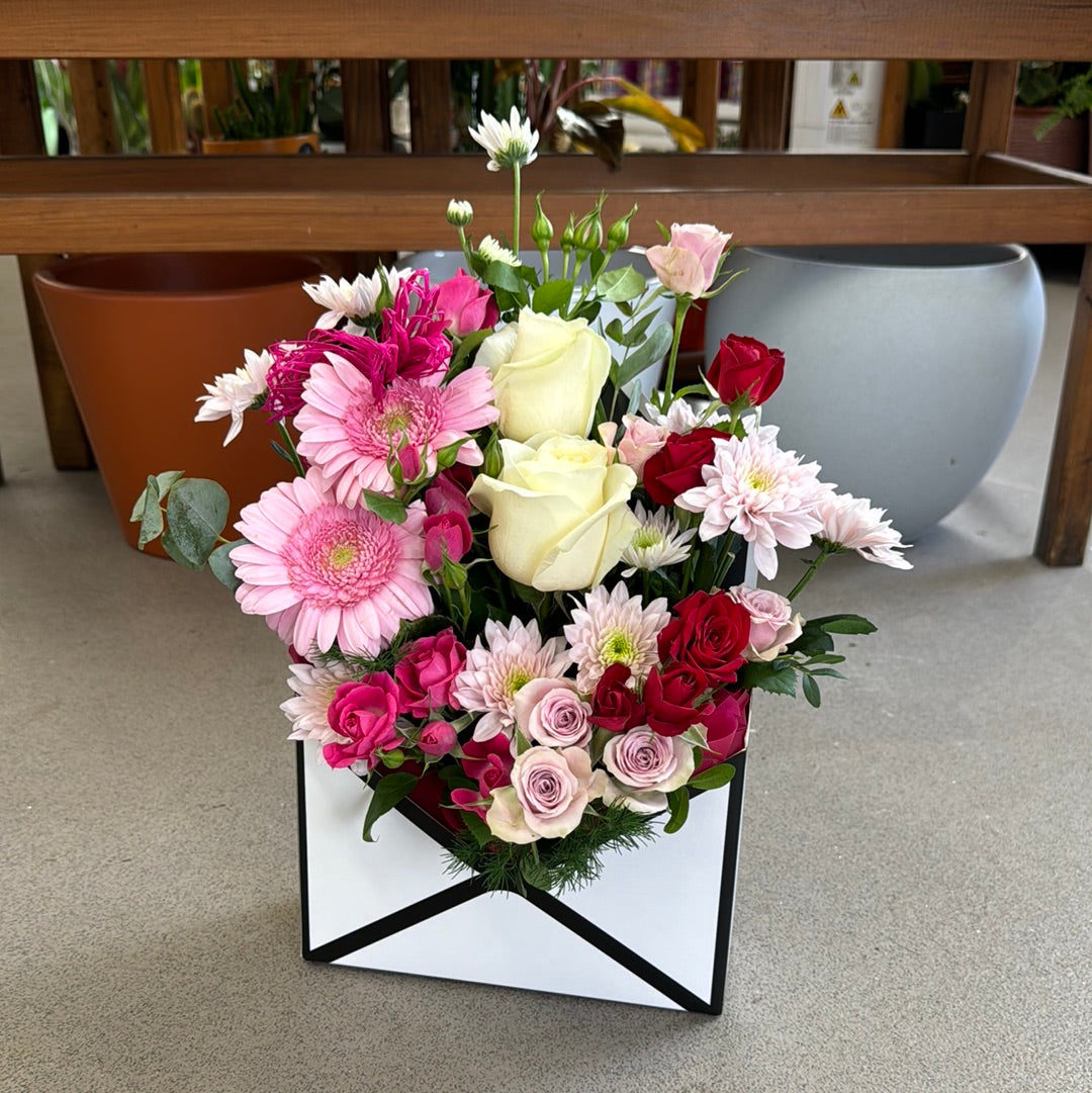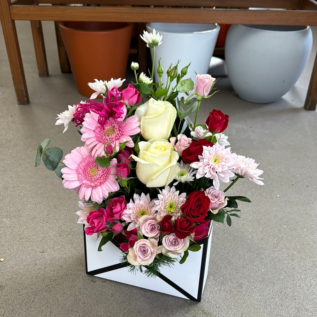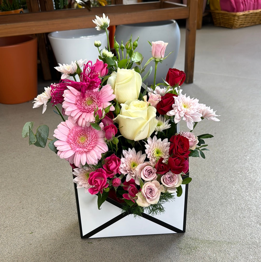 A pretty and feminine display of roses and gerbera. A desktop arrangement created in an envelope shaped giftbox. Arranged in floral foam for ease of care. An ideal gift for someone that has limited space, such as a recipient in a care home or office.